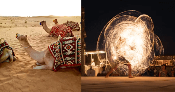 - Desert Safari: Camp fire, folk dance and delicious food in the desert, 11 km away from Dubai, is something else. To reach here, tourists are taken by SUV car from a fixed pickup point through winding, bumpy roads. Sitting arrangements have been made in a large circle in the middle of the desert. Arabic, belle and cultural dances and tricks are shown right in the middle of the circle. Tourists can enjoy this and click photos wearing traditional Arabic costumes, Can ride a camel, many food dishes are available here which can be enjoyed!